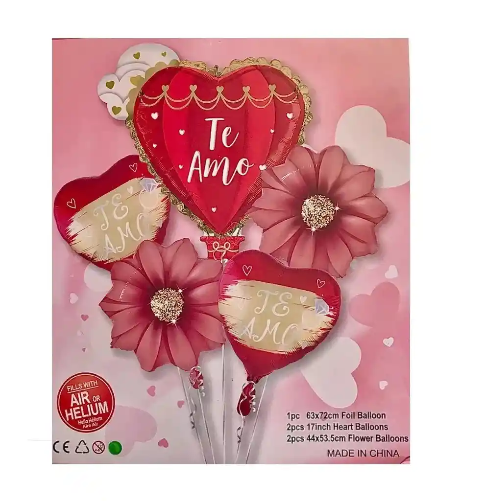 Bouquet Globos Metalizados 5 Piezas Te Amo flores y corazon, Amor Y Amistad San Valentín