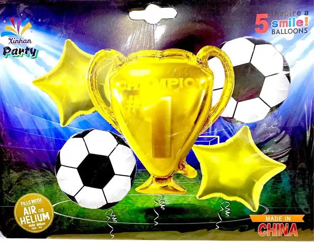 Bouquet Globos Metalizados 5 Piezas Futbol, ideal para decorar las fiestas con tus amigos, Contiene 3 globo metalizado de Futbol y 2 estrellas metalizadas doradas. El producto se envía desinflado