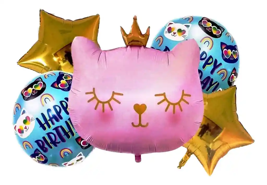 *********************GLOBOS Y PELUCHES MASMELO********************* Por tu compra te llevas: 1 Globo Cabeza Gata Roada 62 x 40 cm 2 Globo estrellas doradas 45×45 cm 2 Globo circulo happy birthday 45 x 45 cm *Los globos se entregan desinflados, tu compra no incluye el montaje ni la decoración, el servicio de armado no lo tenemos disponible. sin embargo te damos todas las instrucciones para hacer de modo profesional. Si deseas adicionar otros articulos a tu compra puedes escribirnos, recuerda que Somos Globos y Peluches Masmelo Si necesitas variación en los colores, colocar un número, más globos o realizar otros cambios en el diseño original escribenos para ver si podemos hacerlo. Tenemos todo lo necesario para tus decoraciones, somos lo último en tendencias mundiales decorativas. Tenemos disponible: Vasos, platos, manteles, guirnaldas, cubiertos, globos de todo tipo, números, letreros, vela, Etc. Puedes encontrar los articulos de nuestra tienda en el siguiente link, copia y pega, si no encuentas lo que necesitas escribenos: https://www.rappi.com.co/tiendas/900280040-globosypeluchesmasmelo-mt-enc/decoracion-para-fiestas/globos-y-bombas
