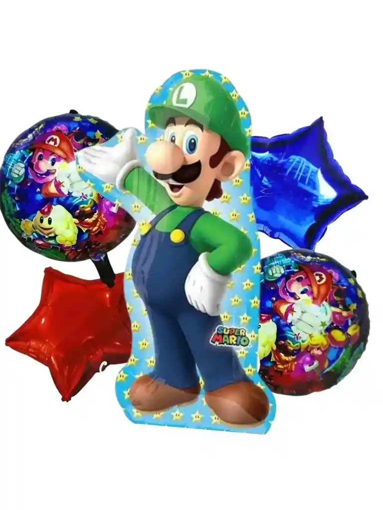 Bouquet Globos Metalizados Mario Bross Luigi 5 Piezas CONTIENE 1 Globo Luigi 65x 45 cm 1 Globo estrella azul 45 x 45cm 1 Globo estrella roja 45 x 45 cm 2 Globo circular Mario 45 x 45 cm. Los globos se envian desinflados