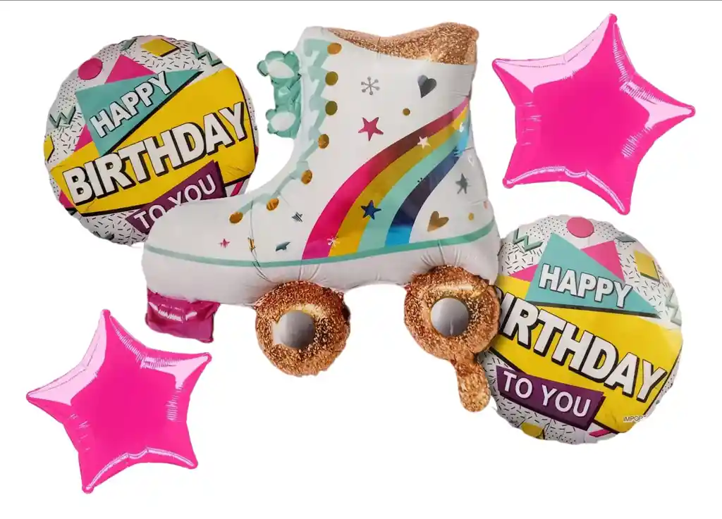 Bouquet X5 Globos Metalizados Patin Arcoíris Happy Birthday To You Por la compra llevas: •1 Globo de Patin Arco iris, tema retro, hip hop, fiesta de cumpleaños, suministros de decoración de globos Tener en Cuenta: •Los Globos Se pueden inflar con aire normal o con Helio. •Los Globos se envian desinflados