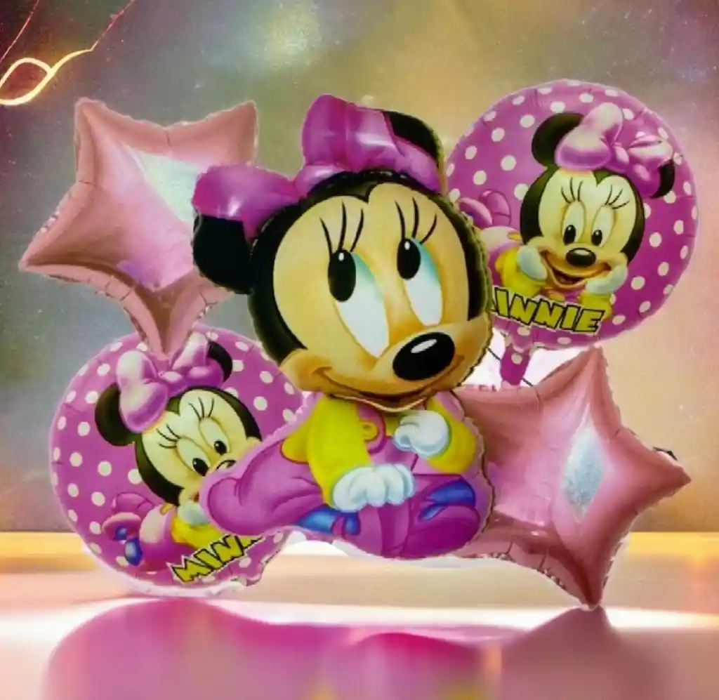 BOUQUET DE GLOBOS X5 PCS - Minnie Baby Medidas: •1 Globo Minnie Baby: 65cm Alto •2 Globo Redondo Estampado:45x45cm, (cada uno) •2 Globo Estrella:45x45cm, (Cada uno) •Se pueden Inflar con Helio