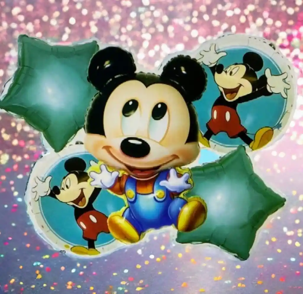 BOUQUET DE GLOBOS X5 PCS - Mickey Baby Medidas: •1 Globo Mickey Baby: 65cm Alto •2 Globo Redondo Estampado:45x45cm, (cada uno) •2 Globo Estrella:45x45cm, (Cada uno) •Se pueden Inflar con Helio