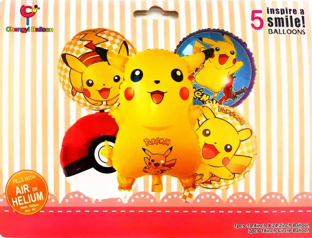 *********************GLOBOS Y PELUCHES MASMELO********************* Por tu compra te llevas. 1 Globo circulo Pokebola 45x45cm 3 Globo temática Pikachu circular 45x45cm 1 Globo Pikachu 65x45cm *Los globos se entregan desinflados, tu compra no incluye el montaje ni la decoración, el servicio de armado no lo tenemos disponible. sin embargo te damos todas las instrucciones para hacer de modo profesional. Si deseas adicionar otros articulos a tu compra puedes escribirnos, recuerda que Somos Globos y Peluches Masmelo Si necesitas variación en los colores, colocar un número, más globos o realizar otros cambios en el diseño original escribenos para ver si podemos hacerlo. Tenemos todo lo necesario para tus decoraciones, somos lo último en tendencias mundiales decorativas. Tenemos disponible: Vasos, platos, manteles, guirnaldas, cubiertos, globos de todo tipo, números, letreros, vela, Etc. Puedes encontrar los articulos de nuestra tienda en el siguiente link, copia y pega, si no encuentas lo que necesitas escribenos: https://www.rappi.com.co/tiendas/900280040-globosypeluchesmasmelo-mt-enc/decoracion-para-fiestas/globos-y-bombas