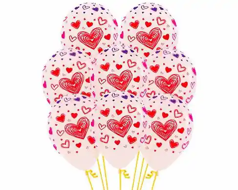 Bouquet de globos de látex inflados con helio, incluye: ·8 Globos transparentes estampados de Corazones en 3 tintas inflados con helio ·1 Pesa sencilla para globos Tiempo aproximado flotación de globos 1 a 2 días. *TIEMPOS ACTUALES DE FLOTACIÓN VARIA DEPENDIENDO DE LA TEMPERATURA Y LAS CONDICIONES ATMOSFERICAS*