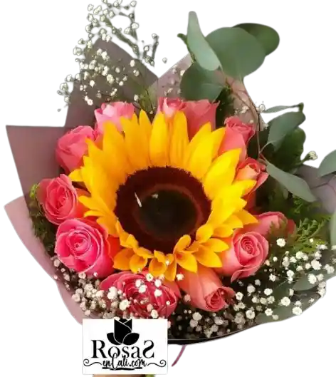 Arreglo floral por 12 rosas, 1 girasol, papel decorativo, moño y tarjeta con mensaje. de color Multicolor ideal para el Felicitaciones