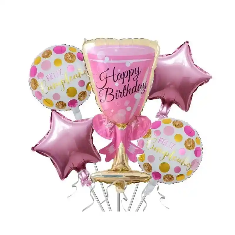 Bouquet x5 Globos Metalizados Copa Rosa •1 Globo Copa Wosa 90cm •2 Globos Estrellas 45x45cm •2 Globos Redondos Estampados Feliz Cumpleaños 45x45cm / Cada uno