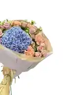Bouquet de 1 hortencia azul 10 clavel salmon y 12 rosas rosadas con clavelina blanca Nota: La flor puede ser sustituida dependiendo la disponibilidad de color y del producto “Mensaje Personalizado” máximo de 30 caracteres (Dejar el mensaje en el chat, los comentarios no se previsualizan para la tienda por lo que si se dejan allí no podrá ser incluido).