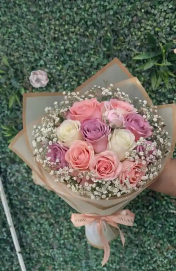 Delicado bouquet de rosas y flores combinadas que transmiten amor y ternura. Perfecto para regalar y llenar el día de romance. 🌸🌹✨