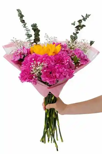 Ramo romántico elaborado con claveles en tonos rosados, acompañados de un girasol central que aporta luz, alegría y un toque especial. Envuelto en papel coreano elegante, que realza los colores y le da un acabado delicado y moderno. Incluye tarjeta para mensaje personal, ideal para expresar tus sentimientos y hacer el detalle aún más significativo. Perfecto para aniversarios, cumpleaños o para sorprender a esa persona especial.