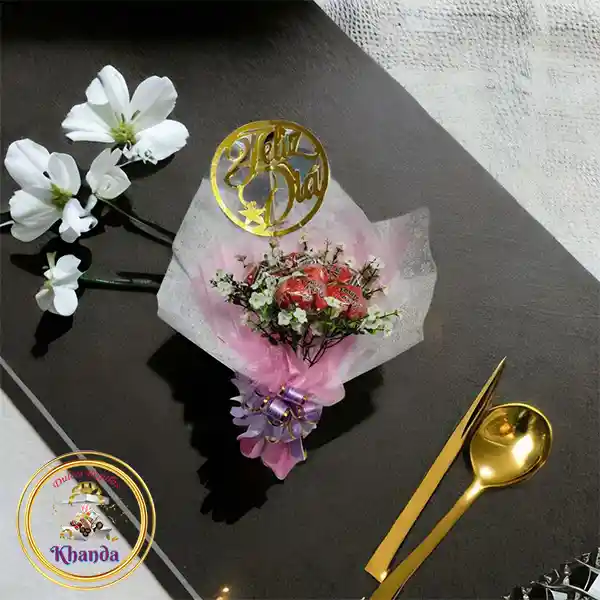 Bouquet Khanda Besos de Amor, contiene: 6 Masmelos con Galleta Besos de Amor x 1 Unidad (Paquete de galleta masmelo cubierta con sabor a chocolate x 16gr.), Adornado con Flores Pequeñas Artificiales.