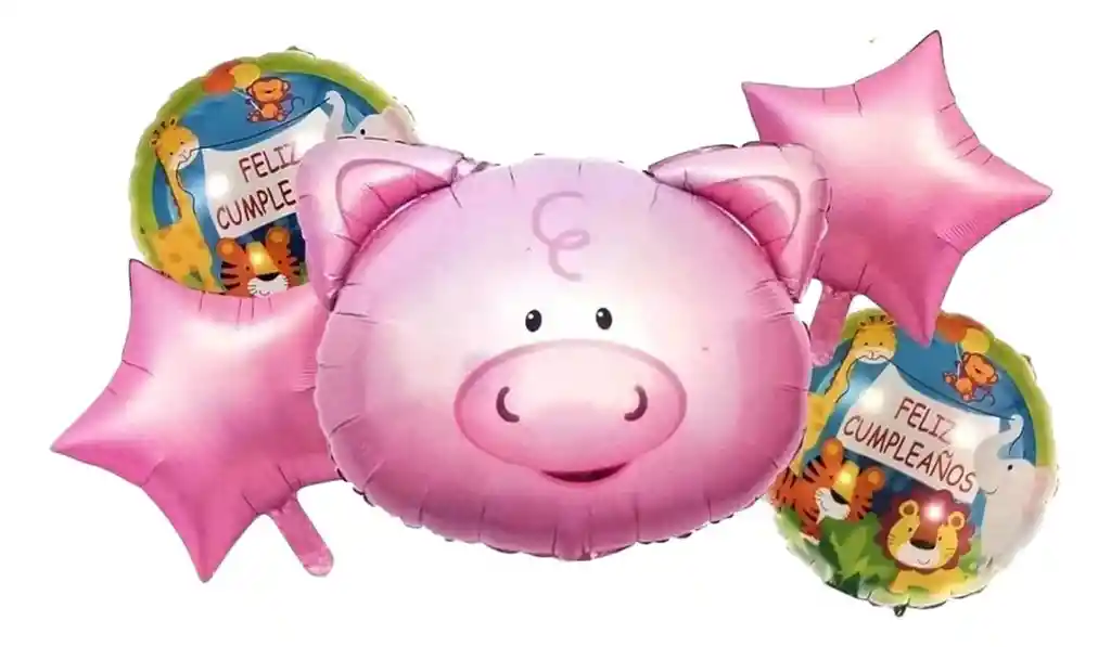 *********************GLOBOS Y PELUCHES MASMELO********************* Por tu compra Llevas: 1 Globo cerdo granja 55x55cm 2 Globo estrella rosada 45x45cm 2 Globo circular temática selva feli cumpleaños 45x45cm *Los globos se entregan desinflados, tu compra no incluye el montaje ni la decoración, el servicio de armado no lo tenemos disponible. sin embargo te damos todas las instrucciones para hacer de modo profesional. Si deseas adicionar otros articulos a tu compra puedes escribirnos, recuerda que Somos Globos y Peluches Masmelo Si necesitas variación en los colores, colocar un número, más globos o realizar otros cambios en el diseño original escribenos para ver si podemos hacerlo. Tenemos todo lo necesario para tus decoraciones, somos lo último en tendencias mundiales decorativas. Tenemos disponible: Vasos, platos, manteles, guirnaldas, cubiertos, globos de todo tipo, números, letreros, vela, Etc. Puedes encontrar los articulos de nuestra tienda en el siguiente link, copia y pega, si no encuentas lo que necesitas escribenos: https://www.rappi.com.co/tiendas/900280040-globosypeluchesmasmelo-mt-enc/decoracion-para-fiestas/globos-y-bombas – En Bogotá despachamos para el mismo día, si haces el pedido antes de las 2PM (no incluye festivos)