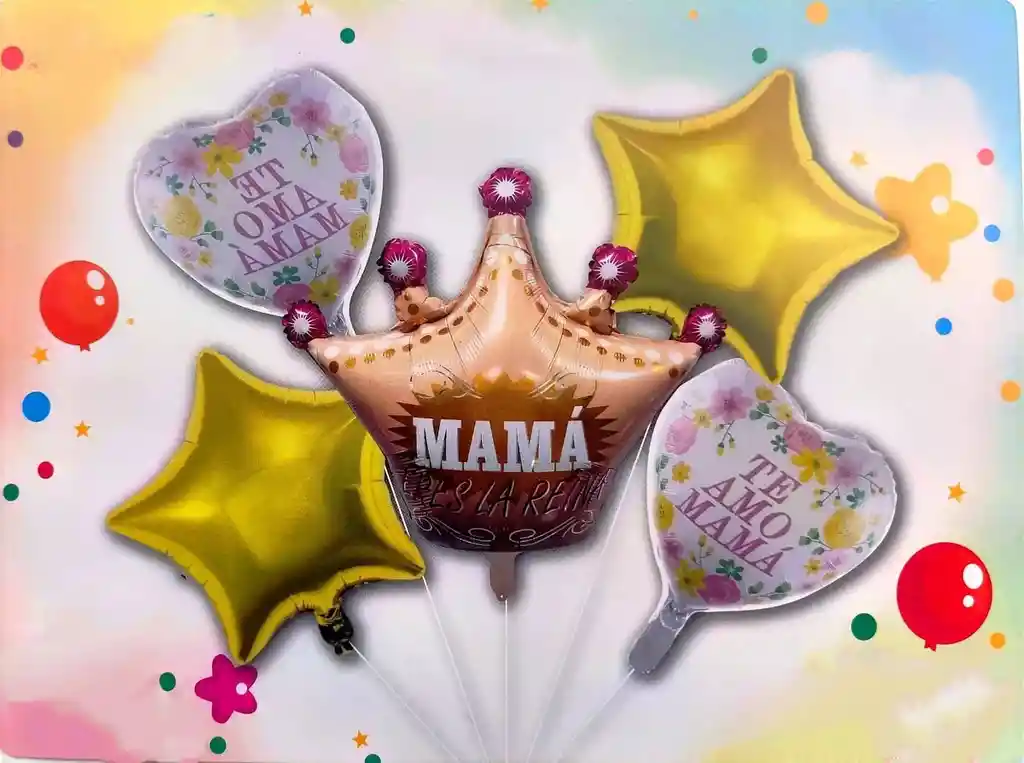 *********************GLOBOS Y PELUCHES MASMELO********************* Por tu compra te llevas. 4 Globo corazón 45x45cm 1 Globo corona mamá eres la reina 60x55cm *Los globos se entregan desinflados, tu compra no incluye el montaje ni la decoración, el servicio de armado no lo tenemos disponible. sin embargo te damos todas las instrucciones para hacer de modo profesional. Si deseas adicionar otros articulos a tu compra puedes escribirnos, recuerda que Somos Globos y Peluches Masmelo Si necesitas variación en los colores, colocar un número, más globos o realizar otros cambios en el diseño original escribenos para ver si podemos hacerlo. Tenemos todo lo necesario para tus decoraciones, somos lo último en tendencias mundiales decorativas. Tenemos disponible: Vasos, platos, manteles, guirnaldas, cubiertos, globos de todo tipo, números, letreros, vela, Etc. Puedes encontrar los articulos de nuestra tienda en el siguiente link, copia y pega, si no encuentas lo que necesitas escribenos: https://www.rappi.com.co/tiendas/900280040-globosypeluchesmasmelo-mt-enc/decoracion-para-fiestas/globos-y-bombas