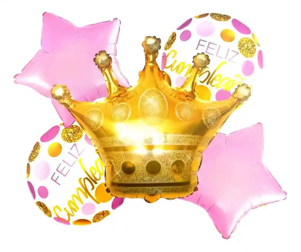 *********************GLOBOS Y PELUCHES MASMELO********************* Por tu compra te llevas. 2 Globo estrella rosada 45x45cm 2 Globo circulo rosado cumpleaños 45x45cm 1 Globo corona 60x55cm *Los globos se entregan desinflados, tu compra no incluye el montaje ni la decoración, el servicio de armado no lo tenemos disponible. sin embargo te damos todas las instrucciones para hacer de modo profesional. Si deseas adicionar otros articulos a tu compra puedes escribirnos, recuerda que Somos Globos y Peluches Masmelo Si necesitas variación en los colores, colocar un número, más globos o realizar otros cambios en el diseño original escribenos para ver si podemos hacerlo. Tenemos todo lo necesario para tus decoraciones, somos lo último en tendencias mundiales decorativas. Tenemos disponible: Vasos, platos, manteles, guirnaldas, cubiertos, globos de todo tipo, números, letreros, vela, Etc. Puedes encontrar los articulos de nuestra tienda en el siguiente link, copia y pega, si no encuentas lo que necesitas escribenos: https://www.rappi.com.co/tiendas/900280040-globosypeluchesmasmelo-mt-enc/decoracion-para-fiestas/globos-y-bombas