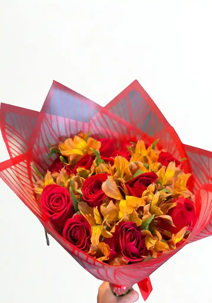 Bouquet De 12 Rosas Rojas Con 1 paquete de Astromelias Naranjas . Nota: La flor puede ser sustituida dependiendo la disponibilidad de color y del producto “Mensaje Personalizado” máximo de 30 caracteres (Dejar el mensaje en el chat, los comentarios no se previsualizan para la tienda por lo que si se dejan allí no podrá ser incluido).