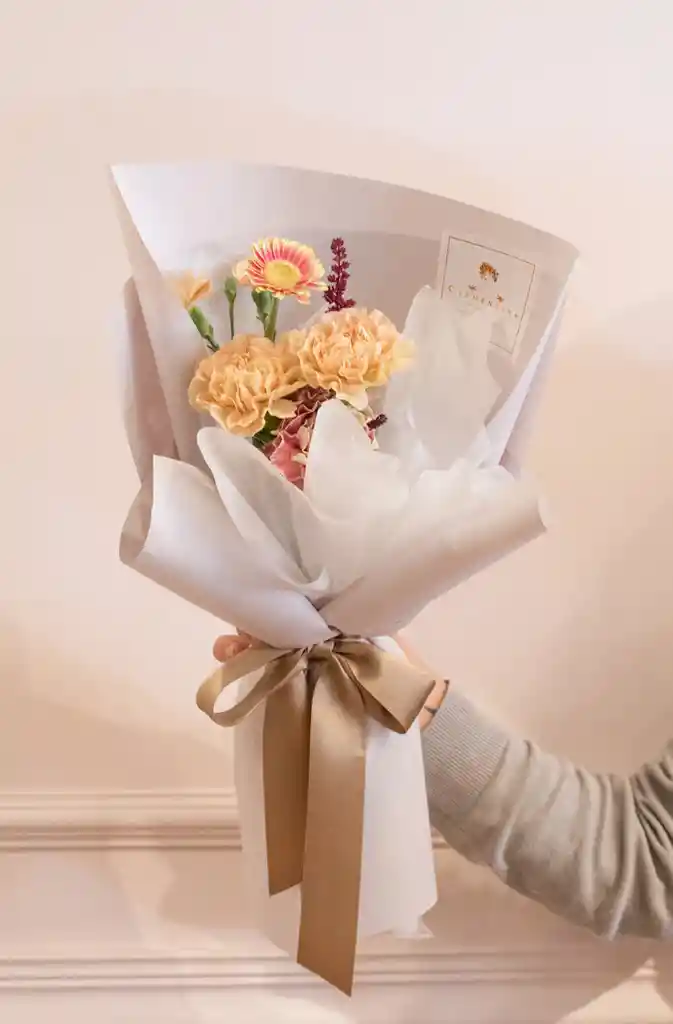 "Bouquet de flores primaverales de larga duración empacadas en finas capas de papel +Vela aromática y decorativa en recipiente de cerámica y tapa de madera. 340 gr - 8.5 oz Aroma: Rosas y Vainilla pomelo"
