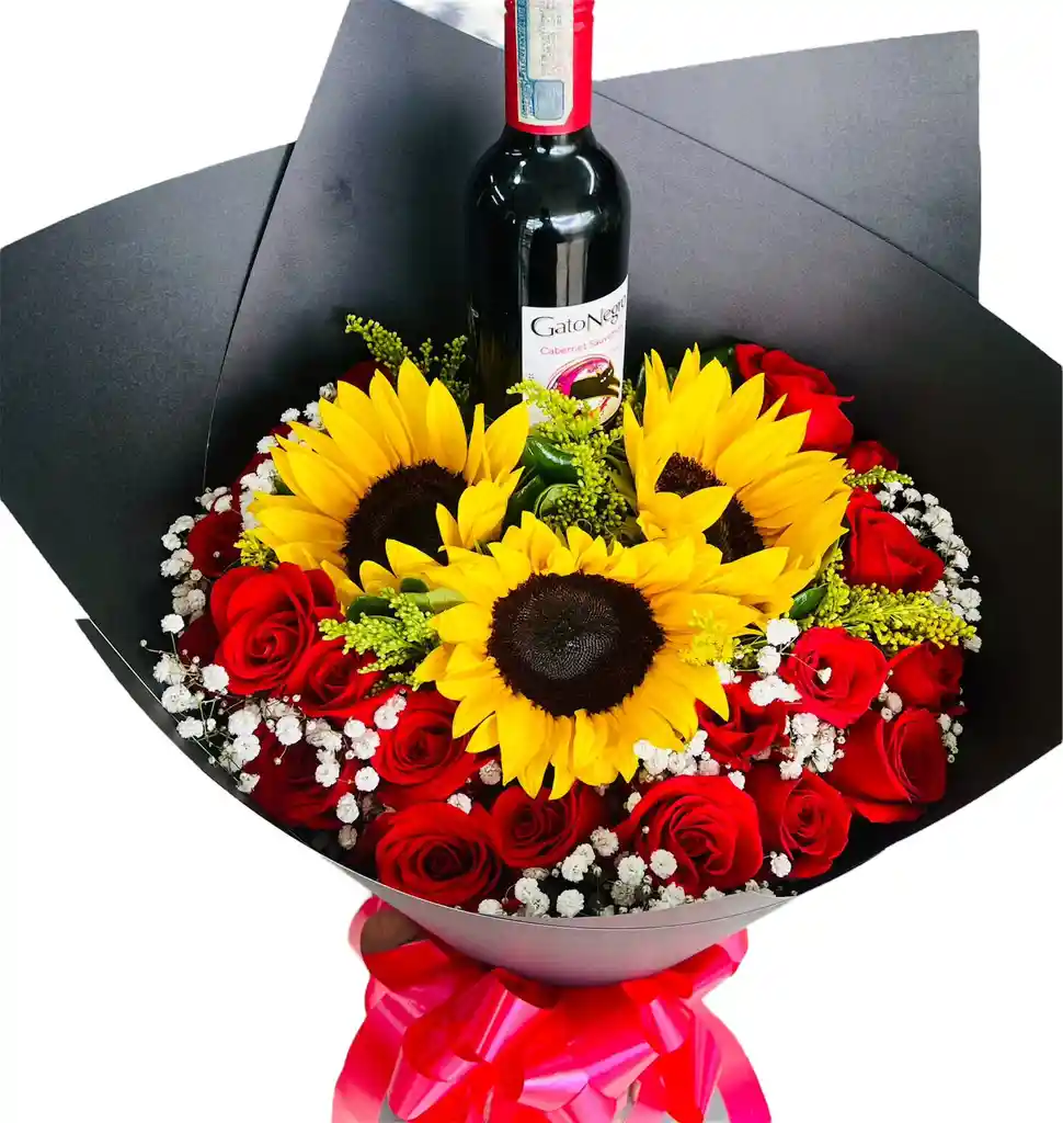 Arreglo floral x15 rosas tipo exportación en tonalidad rojo Botella de vino gato negro 375ml Follaje fino brillantina, gipsófilia, solidago Moño en satín rojo Papel cartulina negro