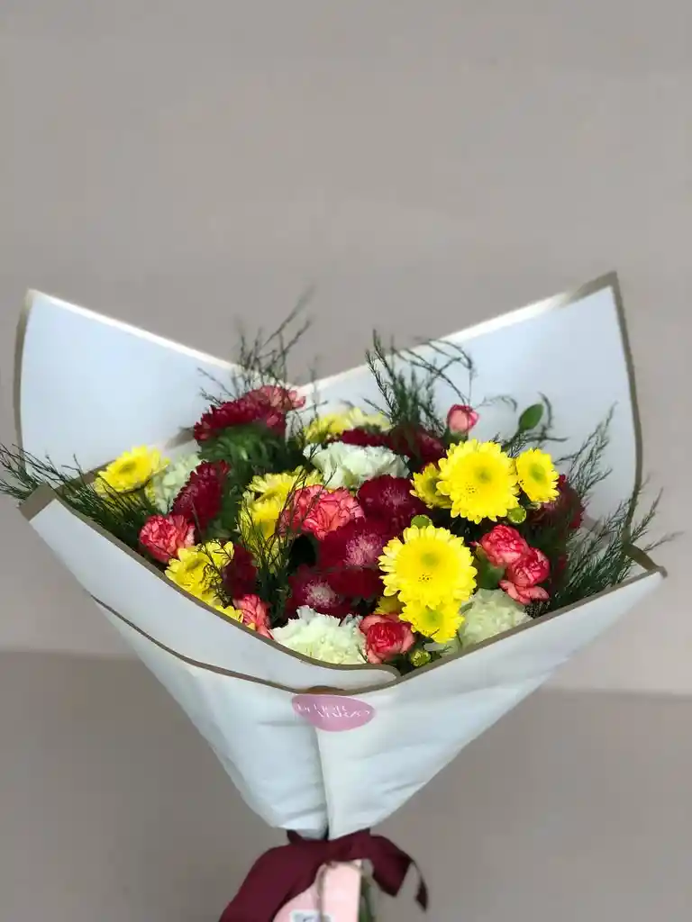 Bouquet 30 tallos Boton amarillo Mini Clavel Tree Fern Clavel