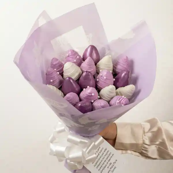 Bouquet por 30 fresas con chocolate, tonos: lila, morado y blanco Envoltura en película trasparente, papel decorativo y moño