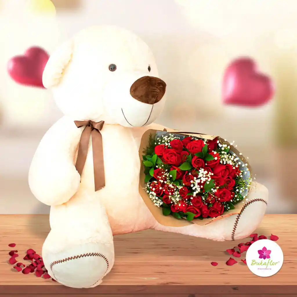 Sorprendel@ en este día con un hermoso bouquet de 50 Rosas y un tierno oso de 85 cm de alto aproximadamente (se entrega perfumado). INCLUYE: Tarjeta con el mensaje que desee. Oso de 85 cm de alto aproximadamente. Bouquet de 50 Rosas. de color Rojo ideal para el Amor