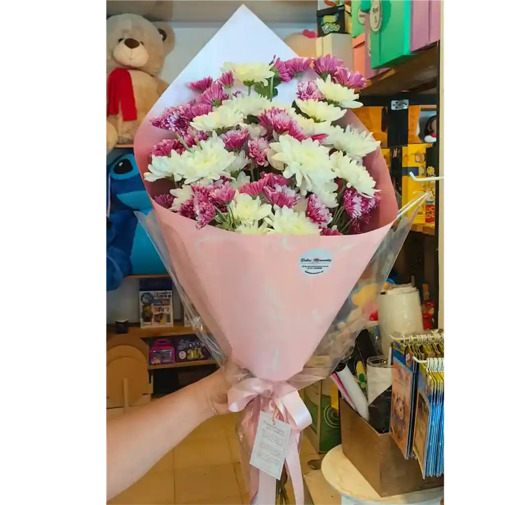 Bouquet de margaritas en tonos blanco y fucsia, fresco y lleno de vida. Un regalo elegante y natural, perfecto para cumpleaños, aniversarios o agradecimientos. Color de flor sujeto a disponibilidad.