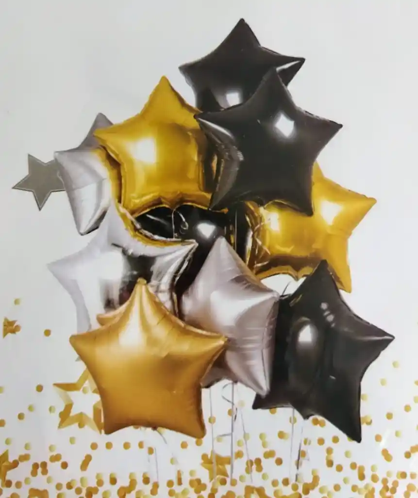 Bouquet Metalizado Estrellas •4 Globos Estrellas Color Negro: 45cm X 45cm •3 Globos Estrellas Color Dorado:45x45cm •3 Globos Estrellas Color Plateado:45x45cm