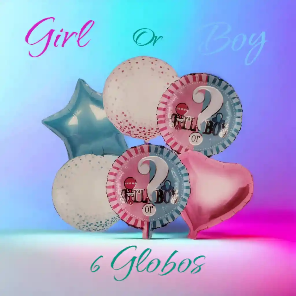 BOUQUET GLOBOS METALIZADOS/LATEX CONFETI REVELACION GÉNERO / 6 PIEZAS •2 Globo Redondo Revelación Genero 50cm •1 Globo Estrella 45cm / Cada uno •1 Globo Corazón 45cm/Cada uno •2 Globos Latex Confeti azul y Rosado / 45cm/ Cada Uno •Se pueden inflar con Helio o con aire. •Se venden desinflados.