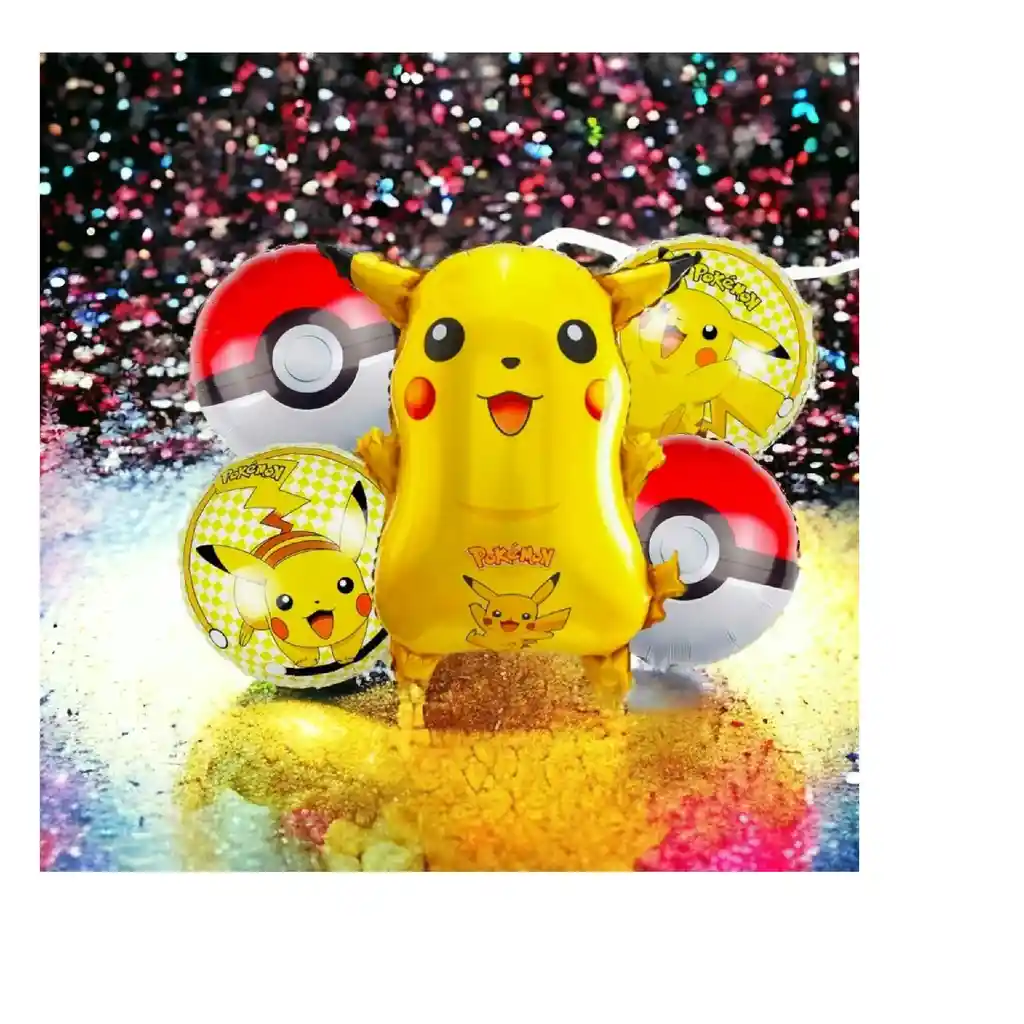 BOUQUET GLOBOS METALIZADOS POKÉMON/ 5 PIEZAS • 1 Globo POKEMON: 70 cm • 2:Globos Redondos Estampado : 45*45cm/cada uno • 2 Globos Redondos 45x45cm/Cada uno •Se pueden inflar con Helio o con aire. •Se venden desinflados.