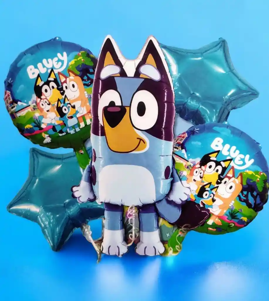 BOUQUET GLOBOS METALIZADOS BLUEY / 5 PIEZAS • 1 Globo BLUEY: 75 cm • 2 Globos Redondos Estampados 45x45cm/Cada uno • 2 Globos Estrellas 45x45cm/Cada uno •Se pueden inflar con Helio o con aire. •Se venden desinflados. •La imagen de los globos que acompaña la imagen principal puede variar.