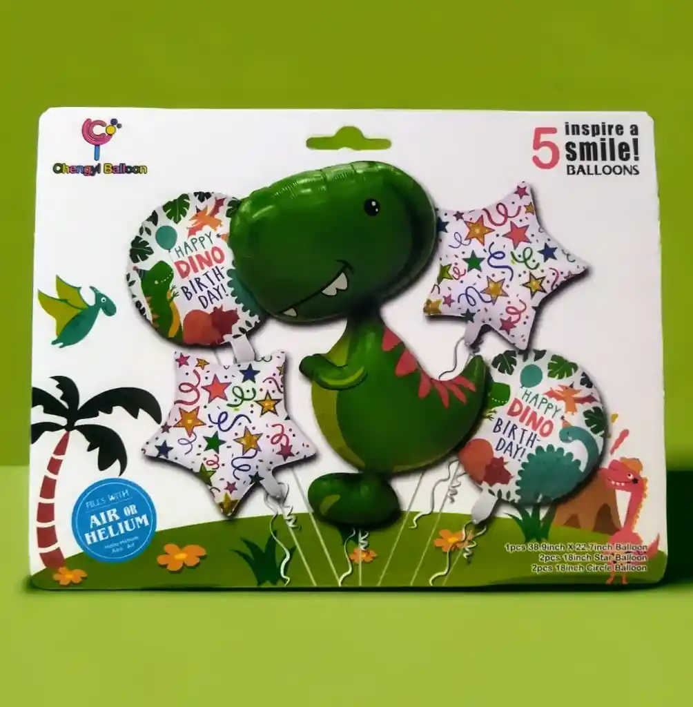 BOUQUET GLOBOS METALIZADOS DINO FELIZ CUMPLEAÑOS/ 5 PIEZAS • 1 Globo DINO: 1.00 METRO • 2 Globos Estrella: 45*45cm/ cada uno • 2 Globos Redondo Happy Birthday 45x45cm/Cada uno •Se pueden inflar con Helio o con aire. •Se venden desinflados.