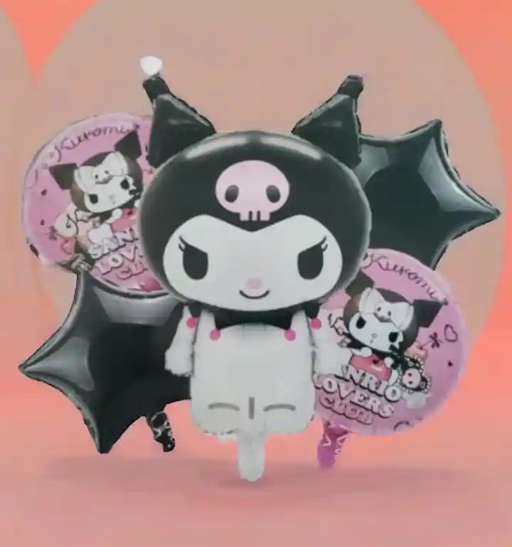 BOUQUET GLOBOS METALIZADOS KUROMI / 5 PIEZAS • 1 Globo KUROMI: 60 Cm •2 Globos Redondos Estampados 45x45cm/Cada uno •2 Globos Estrella: 45x45cm/ Cada uno •Se pueden inflar con Helio o con aire. •Se venden desinflados. •La imagen de los globos que acompaña la imagen principal puede variar.