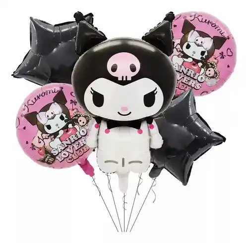 BOUQUET GLOBOS METALIZADOS KUROMI / 5 PIEZAS • 1 Globo KUROMI: 60 Cm •2 Globos Redondos Estampados 45x45cm/Cada uno •2 Globos Estrella: 45x45cm/ Cada uno •Se pueden inflar con Helio o con aire. •Se venden desinflados. •La imagen de los globos que acompaña la imagen principal puede variar.