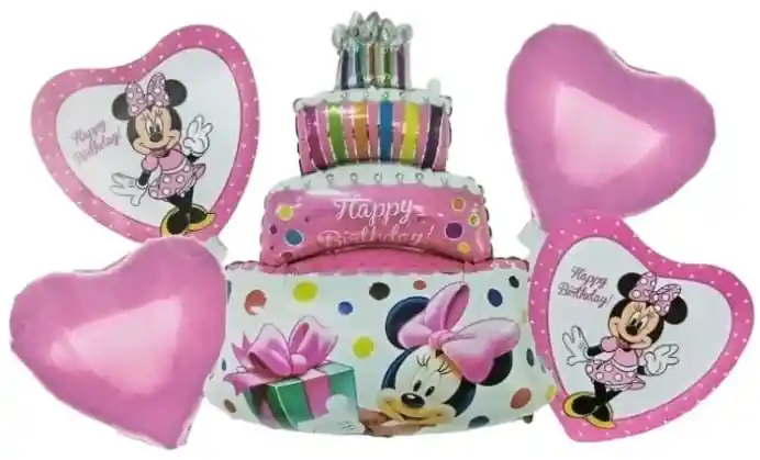 Bouquet Metalizado X 5 Globos MINNIE MOUSE HAPPY BIRTHDAY •1 Globo Pastel Gigante Minnie Mouse: 92cm •2 Globos Corazón: 45cm / Cada uno •2 Globos Corazon Estampado Minnie:45cm/ Cada uno