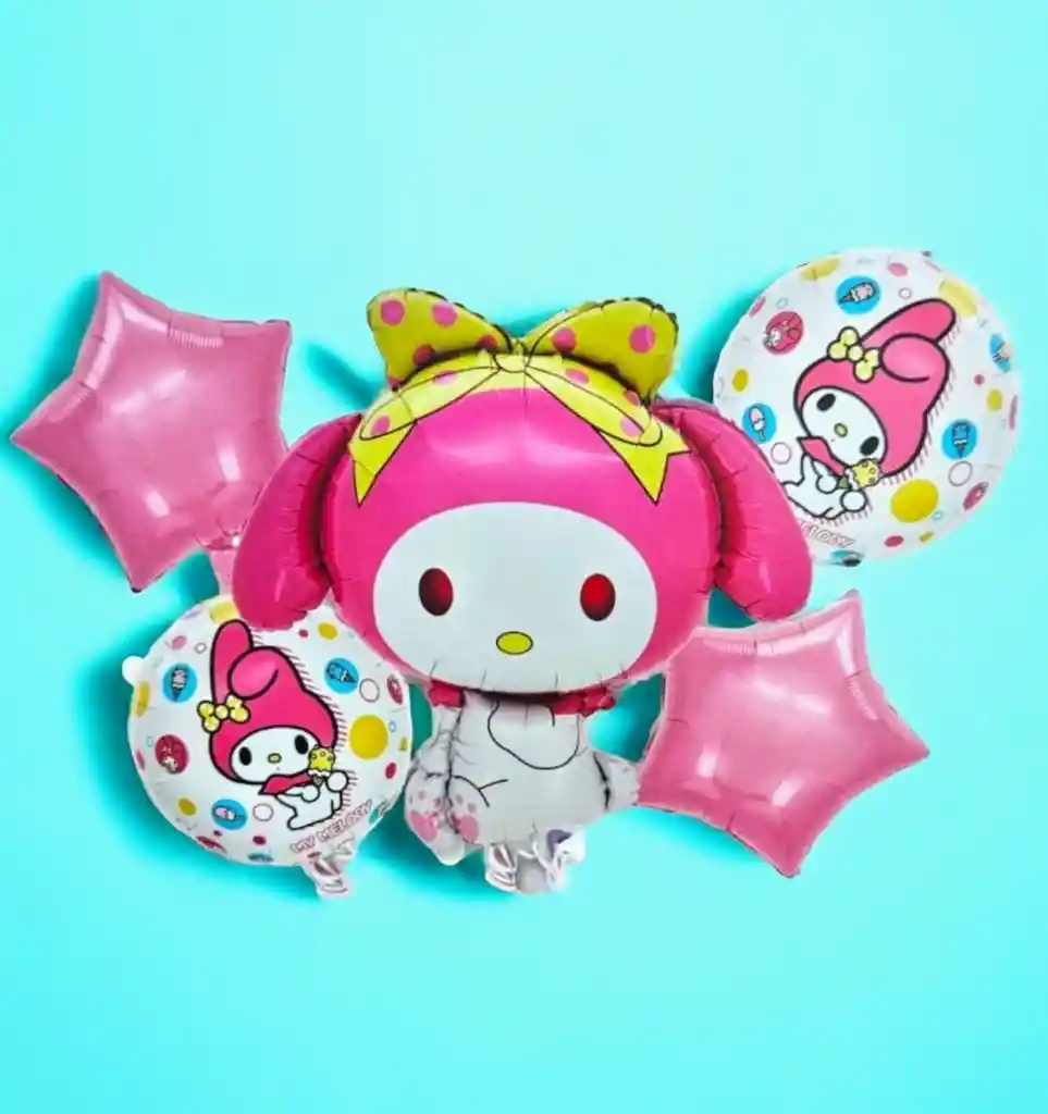 BOUQUET GLOBOS METALIZADOS MY MELODY/ 5 PIEZAS • 1 Globo MELODY: 55cm •2 Globos Redondos Estampados 45x45cm/Cada uno •2 Globos Estrella: 45x45cm/ Cada uno •Se pueden inflar con Helio o con aire. •Se venden desinflados. •La imagen de los globos que acompaña la imagen principal puede variar.