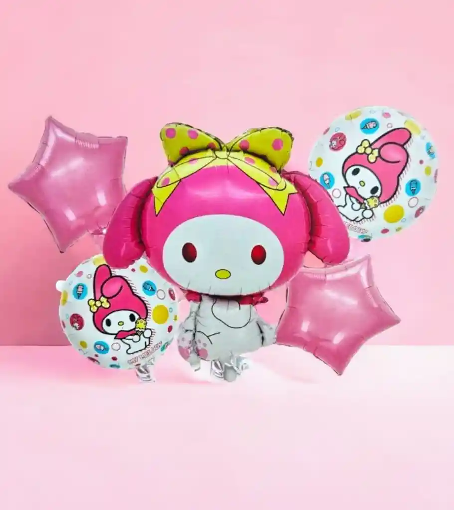 BOUQUET GLOBOS METALIZADOS MY MELODY/ 5 PIEZAS • 1 Globo MELODY: 55cm •2 Globos Redondos Estampados 45x45cm/Cada uno •2 Globos Estrella: 45x45cm/ Cada uno •Se pueden inflar con Helio o con aire. •Se venden desinflados. •La imagen de los globos que acompaña la imagen principal puede variar.