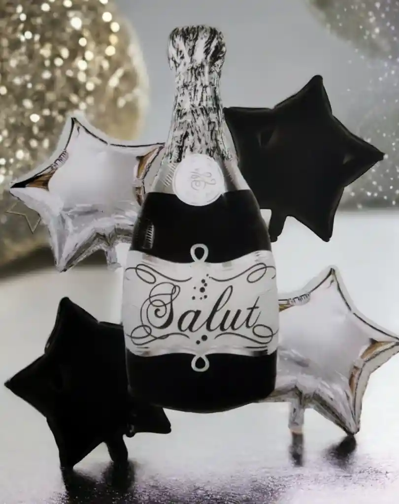 BOUQUET DE GLOBOS X5 PCS - Champagne Medidas: •1 Globo Champagne:106c cm Alto (GRANDE) •4 Globos Estrella: 45x45cm, (Cada uno) •Se pueden Inflar con Helio