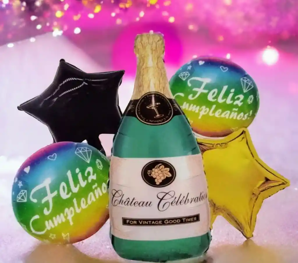 BOUQUET DE GLOBOS X5 PCS - Champagne Feliz Cumpleaños Medidas: •1 Globo Champagne:106c cm Alto (GRANDE) •2 Globos Redondo Feliz Cumpleaños:45x45cm (cada uno) •2 Globos Estrella: 45x45cm, (Cada uno) •Se pueden Inflar con Helio
