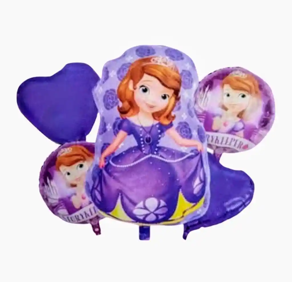Bouquet X5 Globos Metalizados Princesa Sofia * 1 Globo Princesa Sofia : 60 cm * 2 Globos Redondos Estampado 45*45cm/Cada uno •2 Globos Corazón :45*45cm/Cada uno •Se pueden inflar con Helio o con aire. •Los globos se venden desinflados