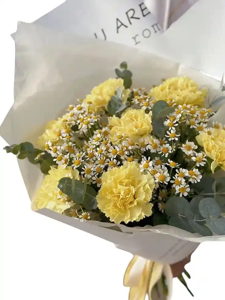 Bouquet de 10 hermosos claveoles color amarillo acompañado de margarita mini y eucalipto