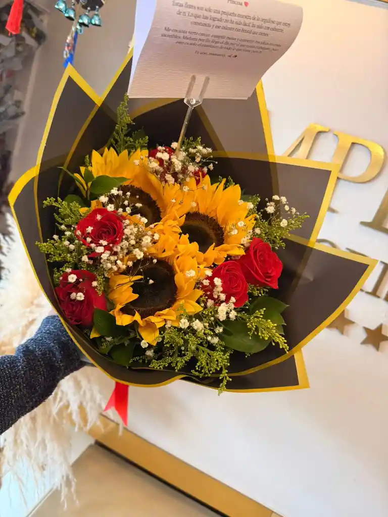 3 girasoles, 5 rosas rojas, 1 gipsofilia, 1 rusco, 1 solidago
