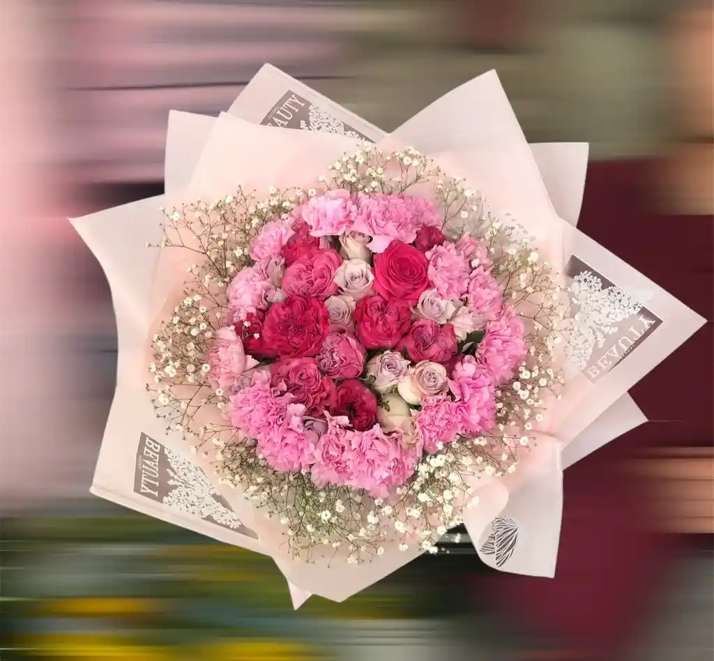 Bouquet de 24 rosas, con clavel o astromelia al rededor (depende disponibilidad en el momento de hacer el pedido) *color de las flores depende de la disponibilidad en el momento de hacer el pedido