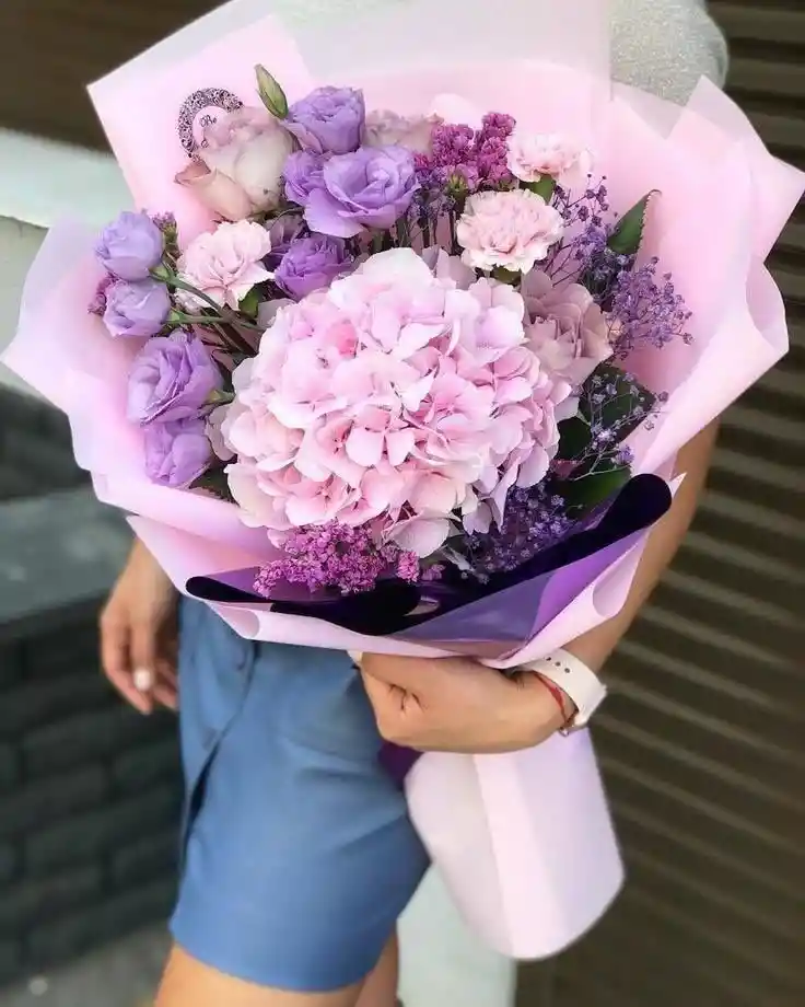 Bouquet morado de 1 hortencia y 12 rosas con gypsophila morada Nota: La flor puede ser sustituida dependiendo la disponibilidad de color y del producto “Mensaje Personalizado” máximo de 30 caracteres (Dejar el mensaje en el chat, los comentarios no se previsualizan para la tienda por lo que si se dejan allí no podrá ser incluido).
