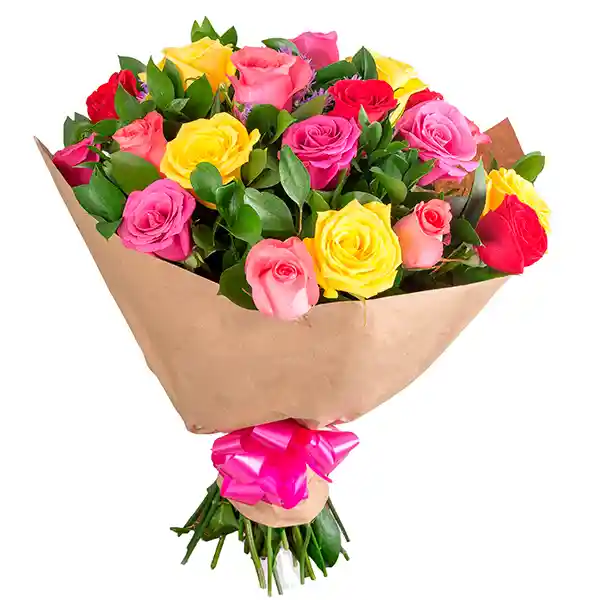 "Lindo bouquet de 24 rosas tipo exportación surtidas con decoración premium. Flores seleccionadas, recién cortadas y enviadas desde el cultivo a tu casa. El tipo de papel y los colores de las rosas, pueden variar de acuerdo a disponibilidad."