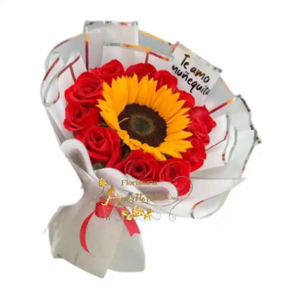 Bouuquet por 12 Rosas, 1 girasol, si deseas un mensaje para la tarjeta lo puedes dejar escrito en el área de observaciones o escribirnos al whatsapp al 3143111616 y enviarnos el mensaje para la tarjeta.