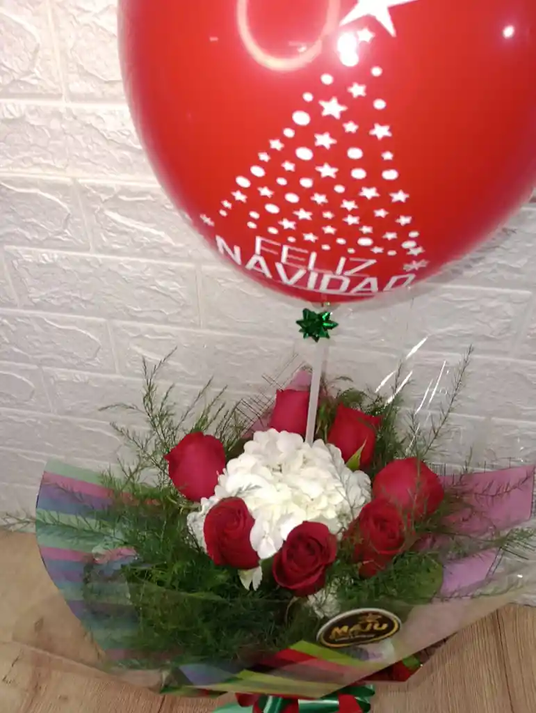 Hermoso bouquet inspirado en la época de navidad con globo ideal para la noche del 4 de diciembre para llevar como presente a sus seres queridos y amigos