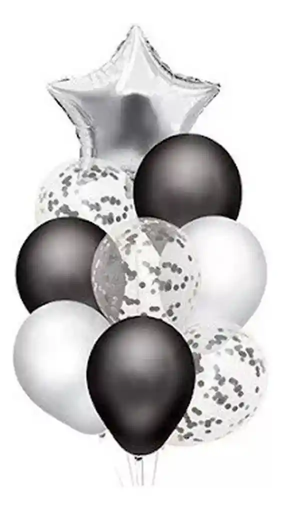 *********************GLOBOS Y PELUCHES MASMELO********************* Por tu compra te llevas. 1 Globo estrella plateado 45x45cm 3 Globo confetti plateado 30 cm 5 Globo negro 30 cm 5 Globo blanco satinado 30 cm *Los globos se entregan desinflados, tu compra no incluye el montaje ni la decoración, el servicio de armado no lo tenemos disponible. sin embargo te damos todas las instrucciones para hacer de modo profesional. Si deseas adicionar otros articulos a tu compra puedes escribirnos, recuerda que Somos Globos y Peluches Masmelo Si necesitas variación en los colores, colocar un número, más globos o realizar otros cambios en el diseño original escribenos para ver si podemos hacerlo. Tenemos todo lo necesario para tus decoraciones, somos lo último en tendencias mundiales decorativas. Tenemos disponible: Vasos, platos, manteles, guirnaldas, cubiertos, globos de todo tipo, números, letreros, vela, Etc. Puedes encontrar los articulos de nuestra tienda en el siguiente link, copia y pega, si no encuentas lo que necesitas escribenos: https://www.rappi.com.co/tiendas/900280040-globosypeluchesmasmelo-mt-enc/decoracion-para-fiestas/globos-y-bombas