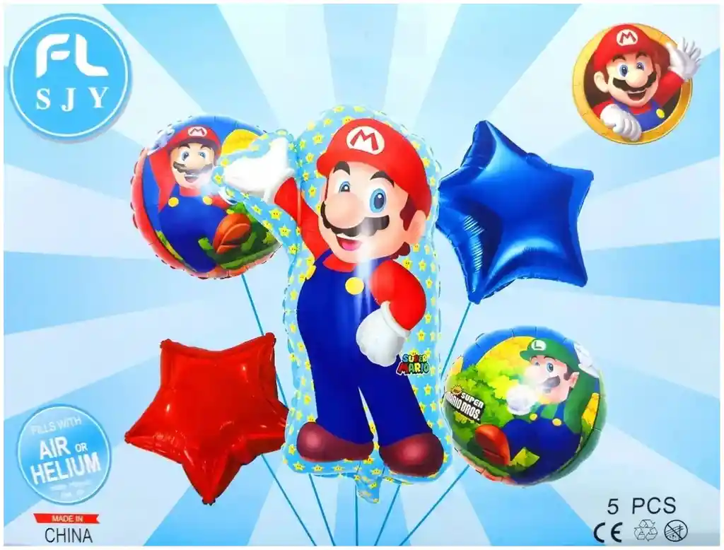 Bouquet globos metalizados Mario Bross 5 Piezas CONTIENE 1 Globo Mario Bros 65x 45 cm. 1 Globo estrella azul 45 x 45cm 1 Globo estrella roja 45 x 45 cm. 1 Globo circular Luigi 45 x 45 cm. 1 Globo circular Mario 45 x 45 cm SE ENVIA DESINFLADO. Para inflar sus globos metalizados y de látex, tenemos disponible en nuestra tienda el INFLADOR MANUAL. No olvide incluirlo en su pedido