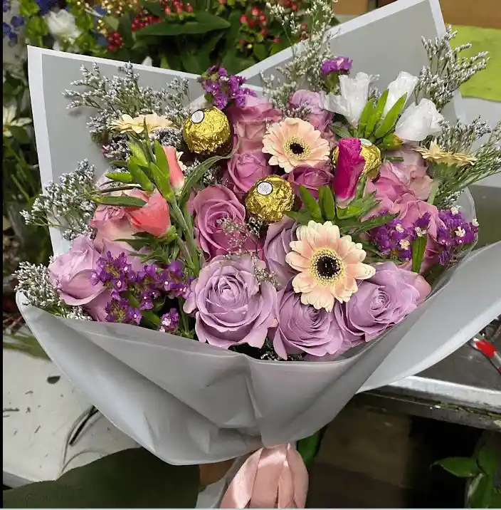Bouquet hecho con 30 tallos con rosas, bocas de dragon, Eucalipto Baby y envoltura en papel coreano
