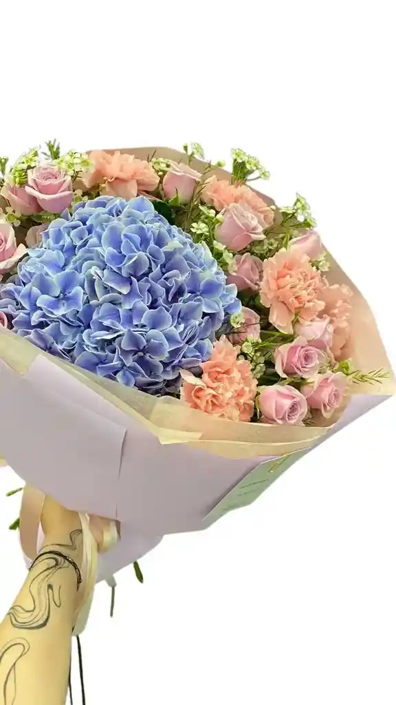 Bouquet de 1 hortencia azul 10 clavel salmon y 12 rosas rosadas con clavelina blanca Nota: La flor puede ser sustituida dependiendo la disponibilidad de color y del producto “Mensaje Personalizado” máximo de 30 caracteres (Dejar el mensaje en el chat, los comentarios no se previsualizan para la tienda por lo que si se dejan allí no podrá ser incluido).