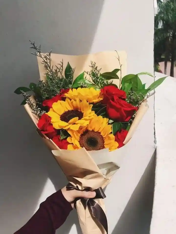 Incluye: Rosas rojasx 6, girasoles x3, rusco, decoracion y mensaje personalizado